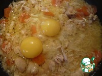 На рис разбиваем яйца, не повредив желтки. Снова накрываем крышкой и держим на слабом огне до готовности яиц. |
