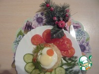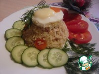 Формируем порцию. Я положил рис в салатник и потом перевернул на тарелку, выложив содержимое. В итоге получилась красивая форма. Сверху кладем яйцо. |