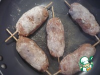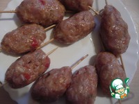 Фарш разделить на 9 частей, сформировать колбаски и вставить деревянные шампуры. |