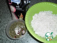 Отварить рис согласно инструкции. В стакане молока замочить на 30 минут манную крупу, сухой зеленый лук, вяленые томаты, семя льна. Затем растворить соль, добавить имбирь и чеснок. |
