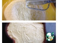 Всыпать разрыхлитель и муку, быстро взбить миксером. Тесто стекает с лопатки, нежное, блестящее. Силиконовую форму смазать растительным маслом и выложить тесто. Отправить пирог в духовку при 180 град. минут на 40. Готовность проверить деревянной шпажкой.