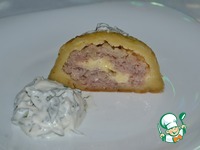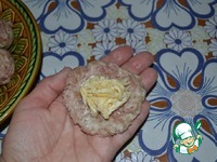 Мясной шарик примять на ладошке, положить немного сырной начинки. Аккуратно скатать в шар так, чтобы сыр оказался в середине. |