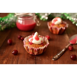 Описание: Ароматные, в меру влажные кексики с зимней ягодой- клюквой. Нежные кексы под шапкой сладкого крема с кисло-сладким курдом, а внутри-взрыв аромата и вкуса! Кексов я делала 1/2 нормы теста, крем целиком, а курда-1/4. Комбинируя джем и чай можно получить множество вариантов вкусов!