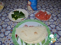 Огурец и сёмгу нарезать брусочками. Листы лаваша порезать пополам, если они круглые. Если лаваш другой формы, то можно порезать на квадраты. |