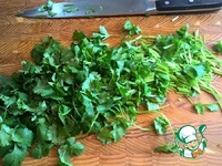 Кинзу (со стеблями) режем крупно и выкладываем в миску с одуванчиком |