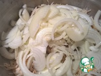 Лук нарезаем очень тонкими полукольцами и добавляем к картошке |