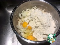 Вбиваем яйца в смесь картошки с луком и добавляем муку |