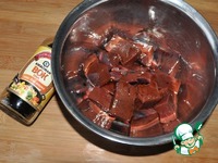 Печень освобождаем от плёнок, режем крупными кусками, заливаем соевым соусом. Для меня тут идеально подходит Соус для жарки BOK Kikkoman. Отставляем мариноваться. |