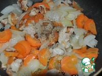 Кладём лук и морковь к салу, добавляем смесь перцев и тушим 10 минут на среднем огне. |