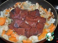Отодвигаем лук с морковью к стенкам сковородки, кладём печёнку. Пару минут обжариваем на сильном огне до подрумянивания. |