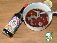 Добавляем к желатину соевый соус, у меня соевый соус Kikkoman для суши и сашими, он содержит сахар и вино. Добавляем сок лимона и сухое белое вино, перемешиваем. Даём раствору остыть. |