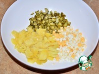 В чашу порезать кубиками огурец, яйца, картофель, перемешать. |