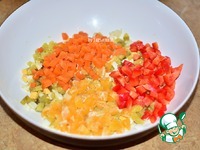 Добавить кубиками - морковь, мандарин, болгарский перец, перемешать. |