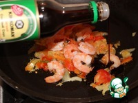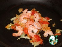Распустить в сковороде сливочное масло, слегка обжарить перец, порезанный полосками и креветки, 2 минуты. |