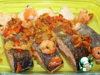 Выложить рыбу в огнеупорное блюдо, сверху выложить перец с креветками вместе с жикостью. Поставить в разогретую до 180 градусов духовку на 10-15 минут. |