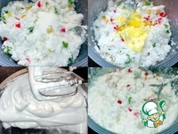 Насыпала сахар, соль, разрыхлитель, ванильный сахар, положила размягчённое масло и налила сливки. Белки взбила с сахаром и ввела их в рисовую массу. |