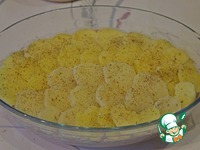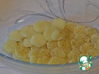 На сыр выложить в 1 слой оставшийся картофель (для верхнего слоя надо оставить самые ровные, крупные ломтики, чтобы "чешуя" выглядела красиво). |