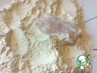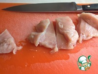 Куриные грудки разрезаем на крупные куски. Отрезаем тонкий кончик, затем каждый кусок разрезаем вдоль, параллельно столу (чтобы он стал тоньше) и затем еще поперек на 3 части. |
