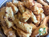По мере обжаривания, выкладываем обжаренные порции в низкую кастрюлю или другую подходящую посуду. Курица пока еще сырая внутри. |