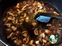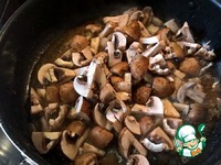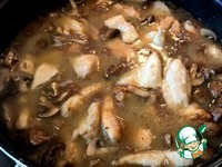 Добавляем курицу в сковороды и добавляем куриный бульон, так, чтобы он проступал через курицу и грибы |