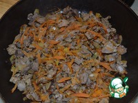 Печенку мелко нарезать. И добавить к луку с морковкой. Посолить и добавить специи. Готовить 15 минут, помешивая. |