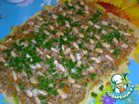 На листья выкладываем обжаренный и остывший мясной фарш. На фарш - фасоль (фасоль нужно не насыпать, а выкладывать ровными рядами). |