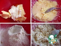Мягкое сливочное масло соединить со сметаной и желтками. Тщательно растереть до образования однородной массы (я взбила миксером). Добавить просеянную муку с разрыхлителем. |