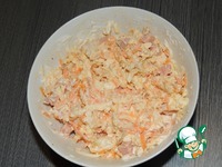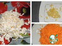 Подсушите в духовке грецкие орехи, затем измельчите. Плавленные сырки и морковь натрите на крупной терке. Чеснок пропустите через пресс. Вареную грудку и ветчину нарежьте кубиками. |