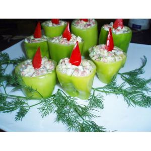 Все ингредиенты смешайте и заправьте майонезом. Начинка готова, теперь необходимо заправить ею все зеленые перцы. |