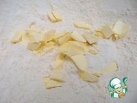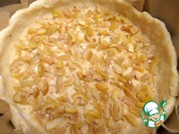 Тесто размять по съёмной форме (диаметр 21 см) с пергаментом, который смазать маслом без запаха. Бортики обязательно. Дно наколоть вилкой. |