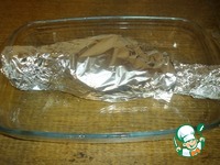 Закрываем рыбу фольгой. Ставим противень в разогретую духовку. |