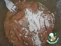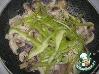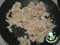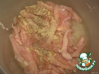 Нарезать грудку соломкой. Посолить, поперчить, добавить специи - по вкусу. |