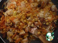 Лук, морковь, грибы, яблоко нарезать кубиком, чеснок измельчить. Все соединить и добавить кукурузу. |