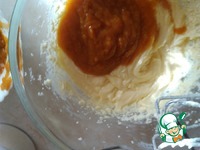После того как яйца вбиты, добавляем пюре хурмы, оно даёт ярко оранжевый оттенок тесту. |