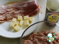 Сыр нарезать небольшими кубиками. Полоски бекона разрезать вдоль на 2 половинки. Так проще будет обматывать наши митболы. |