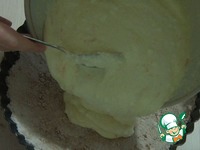 Распределить бОльшую часть теста по форме, делая небольшие бортики, чуть утрамбовать. Вылить нашу подготовленную начинку на тесто. |