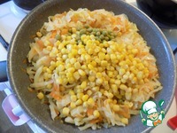 Описание: Белокочанная капуста с овощами: луком, морковью, зелёным горошком и кукурузой, томлёная на свином сале с соусом ВОК KIKKOMAN. Замечательный гарнир или просто основное блюдо. Капусту томлю на все праздники. Отличное дополнение на праздничный стол к горячим блюдам.