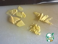 Корень имбиря чистим, нарезаем очень тонкими ломтиками вдоль волокон (0.5 - 1 мм), ломтики нарезаем соломкой вдоль волокон (0.5 - 1 мм) и затем соломку нарезаем мелким кубиком (0.5 - 1 мм) поперек. |