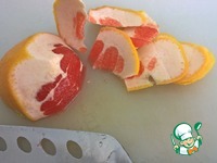 Берем половину грейпфрута, кладем срезом на доску и острым ножом срезаем кожуру, захватывая кожицу долек |