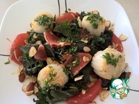 Выкладываем дольки грейпфрута поверх зелени, посыпаем миндалем и поливаем все половиной заправки, оставив вторую половину для гребешков |