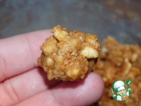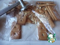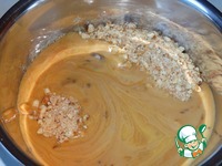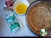 У нас должна получиться такая крошка. Не совсем мелко. Смешиваем в тарелке растопленное масло, и сгущенка (вареную и обычную). |