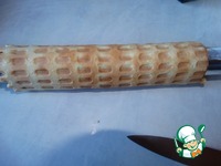 Когда вафля испеклась-начинаю ее закручивать. Накручиваю я ее на обычную бобину от фольги, там остался один слой, и я ее приспособила под каркас для вафель. |