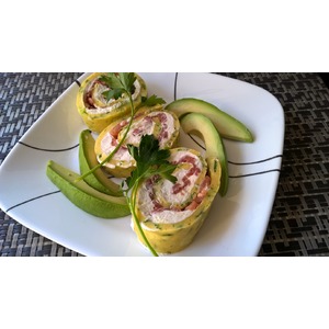 Описание: Это еще один рецепт из передачи замечательного питерского шеф повара Ильи Лазерсона - "Завтрак в постель". Это довольно незамысловатое блюдо, но очень вкусное. Выпекается пласт из омлета и в него заворачивается копченая семга со взбитым сливочным сыром. Взбитый сливочный сыр смягчает резковатый вкус солено-копченой рыбы, а зеленый лук в омлете маскирует рыбный вкус. Омлет с несколько большим, чем обычно, количеством муки придает блюду сытность. Проходит "на ура" в качестве завтрака в выходные дни. Украсить можно листьями салата или подать с авокадо и украсить веточкой петрушки