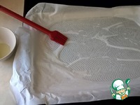 Выстилаем противень пекарской бумагой и смазываем его очень тонким слоем растительного масла - с помощю кисточки. Чтобы бумага прилипла к противню, можно смочить противень небольшим количеством воды. |