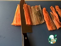Поверх сливочного сыра выкладываем кусочки красной рыбы в один слой - плотно друг к другу |