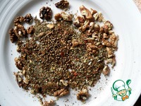 Пряности беру сушеные и толку их в ступке с крупной солью и орехами. Соль впитывает масло и смесь лучше толчется. Однородности не особо добиваюсь. В смеси сушеных трав больше, чем перцев. |