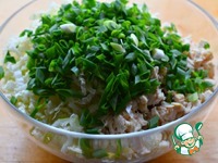 Выложить все ингредиенты в большой салатник, добавить измельченный зеленый лук, заправить соусом (сметаной или майонезом). Все готово! |