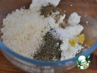 В миске смешать творог и натертый на терке пармезан. Добавить базилик и тимьян. Добавить цедру лимона и лимонный сок. Посолить. Добавить сметану и все хорошо перемешать. |