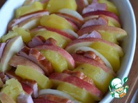 Форму для запекания смазать подсолнечным маслом. Выкладываем кружок картофеля, лук, буженину и яблоко. |
