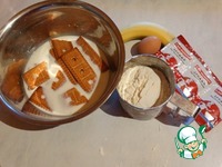 Кладем в миску печенье и заливаем молоком. Нагреваем на плите - печенье размякнет. Добавляем половинку банана. Измельчаем все блендером. |